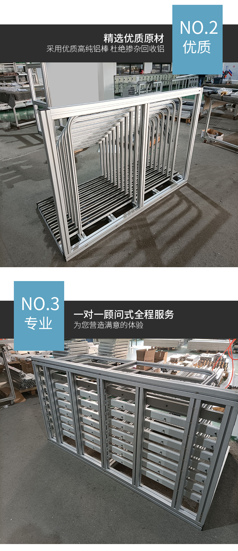 工業(yè)鋁型材材質(zhì)100不含廢鋁,擠壓設(shè)備先進,技術(shù)精良。沒有擠壓痕,表面陽極氧化膜厚度》12um,外觀漂亮、耐臟耐磨、易清洗。
