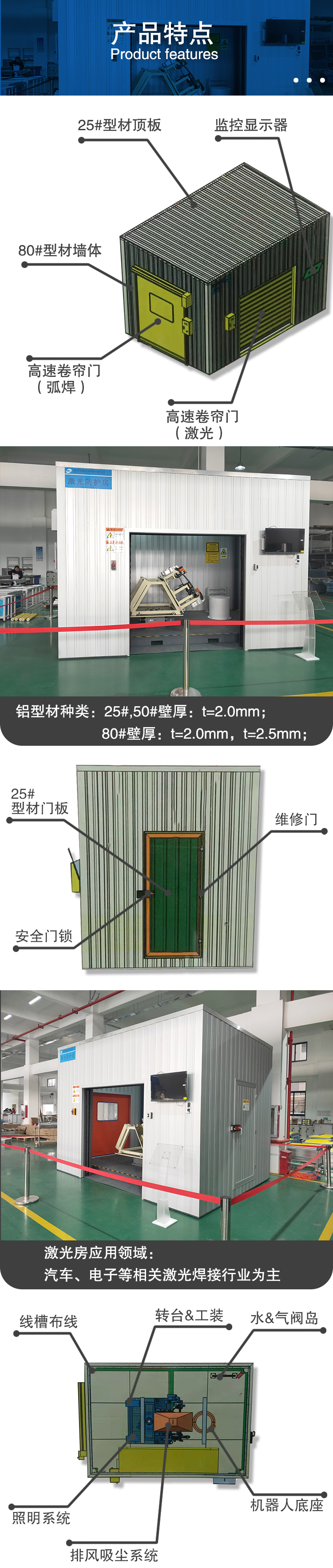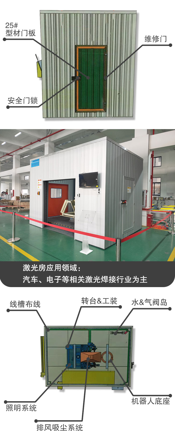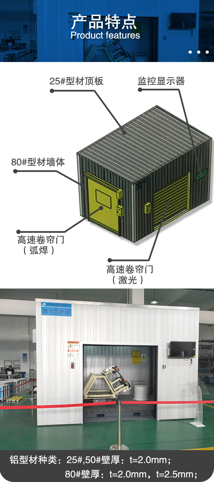 激光器防護(hù)房是在設(shè)備外圍建立安全范圍防護(hù)措施,以劃分安全范圍,阻隔人或物與設(shè)備直接接觸,起到安全警示作用,常和報(bào)警及斷電設(shè)備配套使用。框架部分使用鋁型材,配合絲網(wǎng)、亞克力、PC等各類板材,通過鋁型材配件安裝膨脹螺栓連接鋁型材立柱和地面。 激光房防護(hù)房的厚度、顏色可以按需定制,具有高檔鋁合金、美觀大方 、容易連接、可反復(fù)拆裝 、使用壽命長、永不生銹等優(yōu)勢。