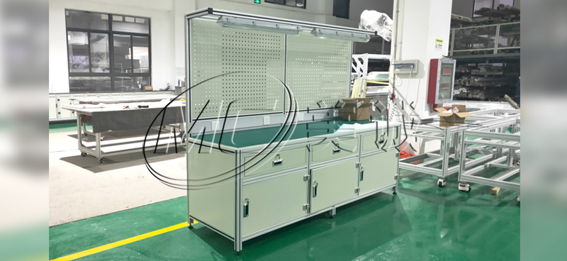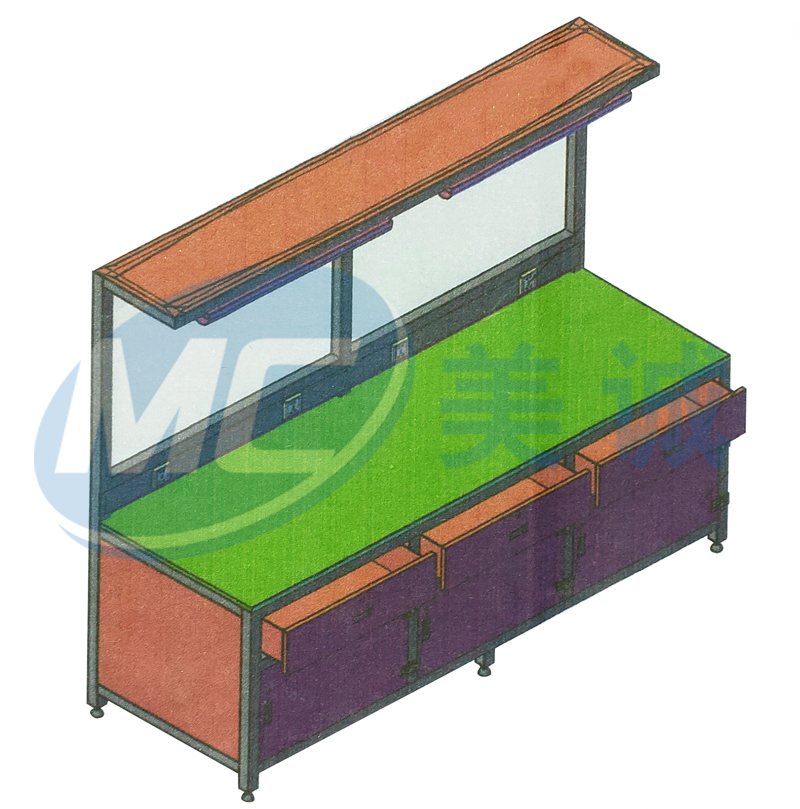 安裝照明燈,下面有柜子和抽屜,可以用來放置物品,整體的框架結(jié)構(gòu)使用鋁型材,臺面部分用18mm密度板加