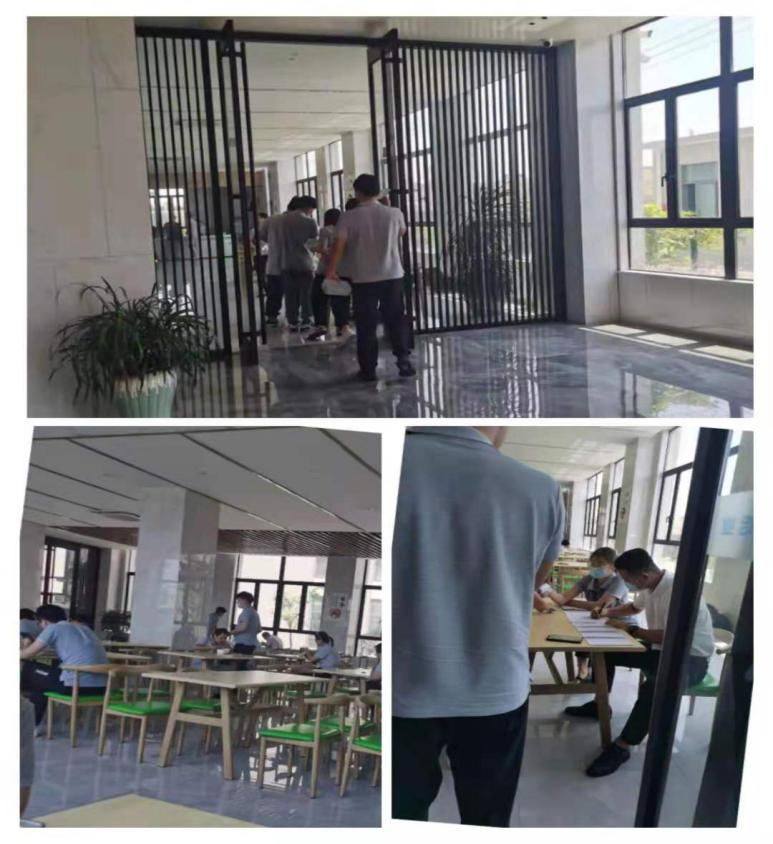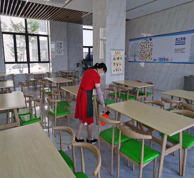 中午公司食堂就餐,安排餐前測溫,就餐期間一人一桌,不交流拉開吃飯的距離減少感染的機會。就餐結(jié)束,每位員工的餐盤自行帶回清洗消毒保管。