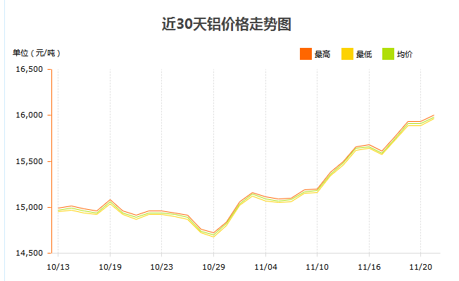 11月23日長江有色鋁錠價格已經(jīng)達(dá)到一萬六的高價位了,是近年來漲幅最大的一次。之前鋁錠價大多數(shù)時候都是在一萬四左右徘徊,低的時候在一萬三左右,高的時候也就在一萬四百五左右。隨著2020年年底的到來,這幾個月眼看著鋁錠價是一天一個樣的往上漲,前幾天是一萬五千多今天果然漲到一萬六了。據(jù)說這個價格會持續(xù)到年底,所以需要鋁型材的用戶們還是要斟酌了。而我們在制作鋁型材報價的時候也要斟酌了!