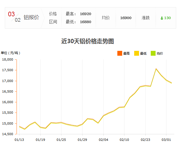 2021年3月2日,根據(jù)長江有色鋁播報出來的鋁價有所下降,這是連日來鋁價首次呈現(xiàn)下降趨勢,當(dāng)然下降的幅度并不明顯,目前鋁價任然在一萬6以上接近一萬7,原材料價格上漲給眾多鋁行業(yè)帶來影響,美誠鋁業(yè)也不例外,溫馨提示大家,訂購鋁型材以及鋁型材框架請注意報價單有效期。